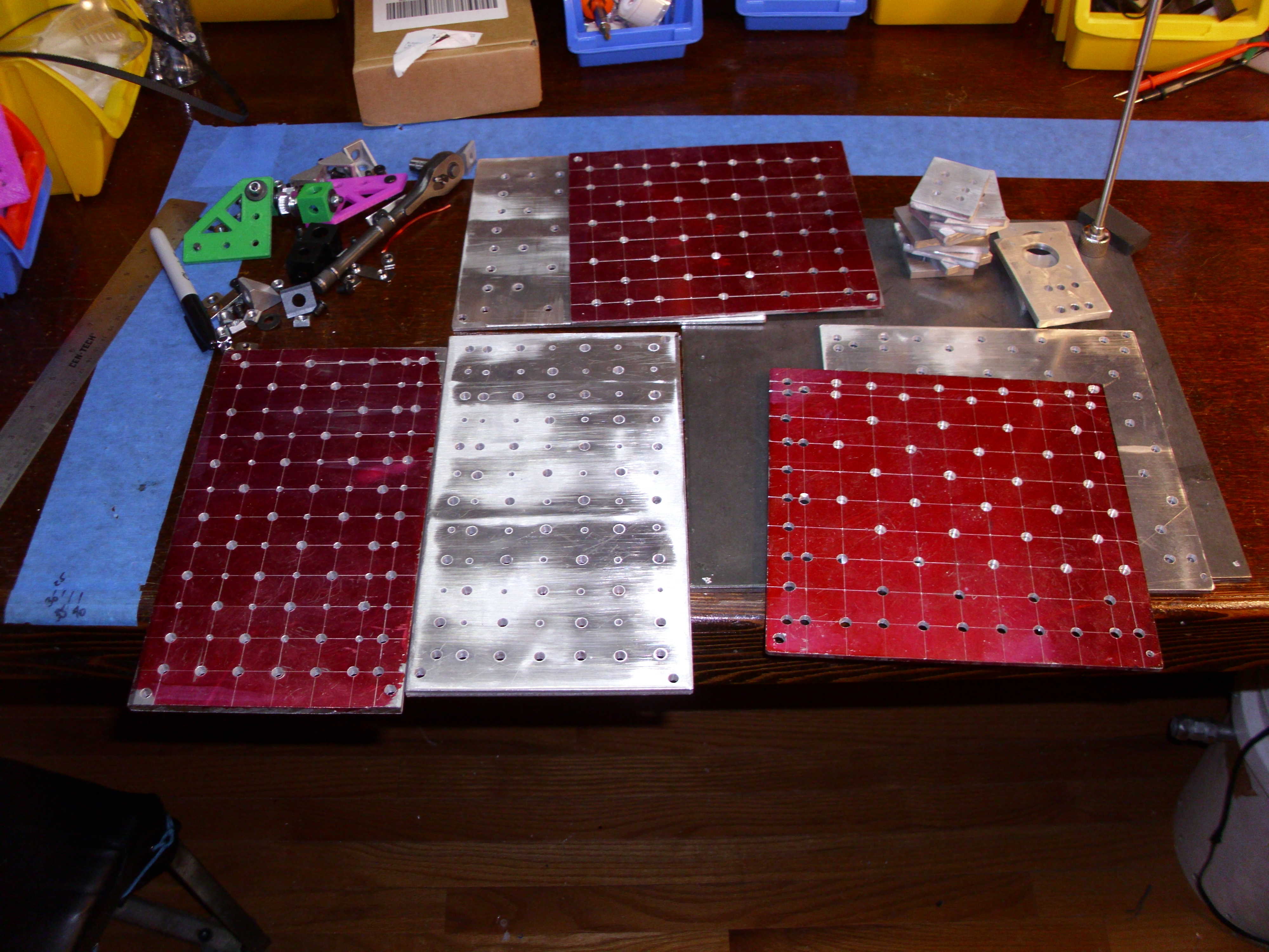 Manually fabricated aluminum plates for new x-axis rail, y-axis trolleys, x-axis trolley and mount to z-axis assembly.