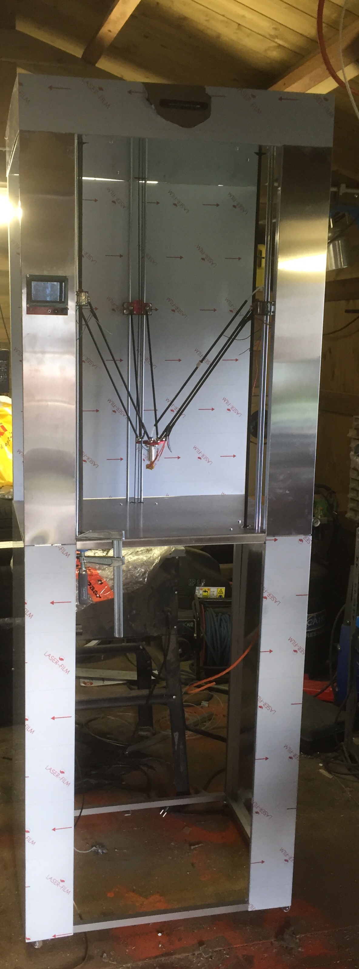 The printer farms houses it's own network switch with wifi and 4 ports. There will be a Raspberry PI with 7inch touch screen and AstroPrint plus a switch to use either Astroprint or an external computer for the connection to the RAMPS1.4. The RAMPS1.4 has it's LCD display trial-fitted on the left