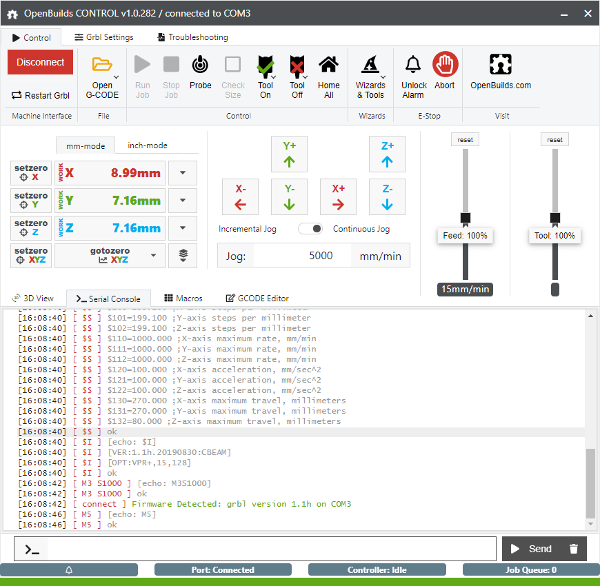 Still nothing in Serial Console? If not: Which version are you on? Which specific Menu item are you clicking under Tool On? Press ctrl+shift+i > Click the Console Tab in Devtools > Click Tool On option again, any errors popup in devtools log? Or if it DOES show up in the console, but does not Switch the spindle: Then its more likely wiring