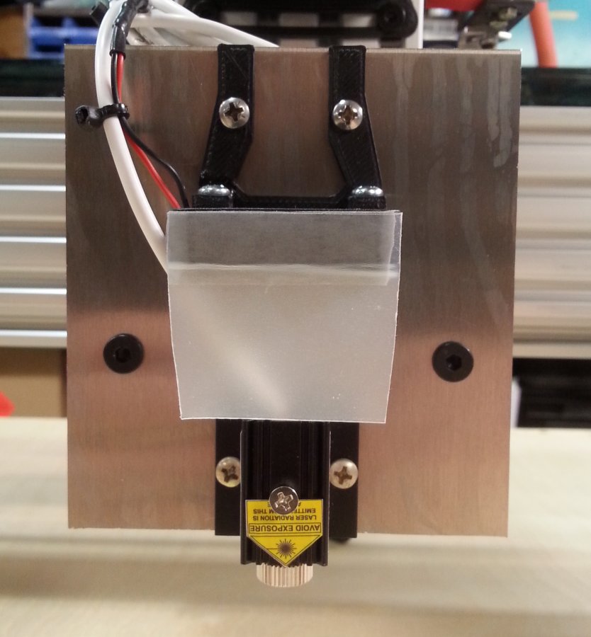 Here is a pic of the whole assembly mounted on the Z axis. Laser and controller is from J-Tech Photonics. I really like the controller, it has great safety features. J-Tech also has the 3D printed mount to fit the controller to the C-Beam Z axis with holes that line up on the 20mm slot centers. I also bought some laser blocking acrylic from J-tech, and made a little rectangular shield to go around the laser. Of course, just after I bought the 2.8W, they came out with a 3.8W. Only requires 1 connection to PWM out from Arduino, you can control laser power from the g-code. I'm using GRBL 1.1F which has Laser Mode, it works like a dream.
