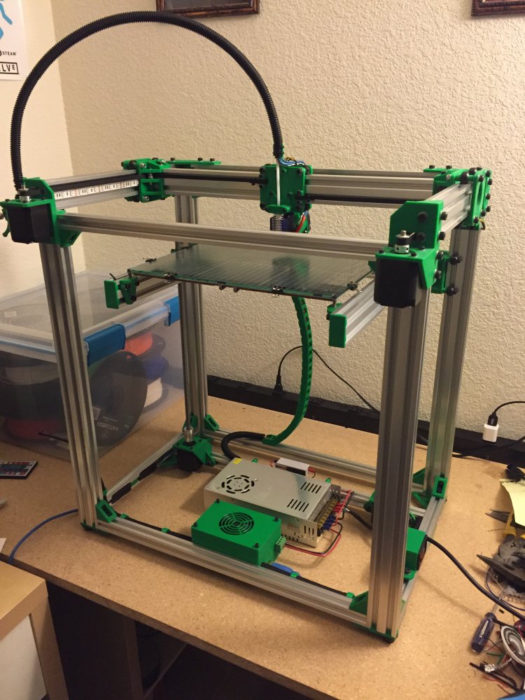 A robust Core XY style 3D printer that has a clean parallel belt implementation and whose dimensions are adaptable to meet builder's needs. The use of open builds V-slot and other open hardware make customization easy.