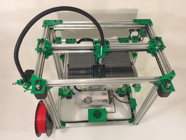A robust Core XY style 3D printer that has a clean parallel belt implementation and whose dimensions are adaptable to meet builder's needs. The use of open builds V-slot and other open hardware make customization easy.