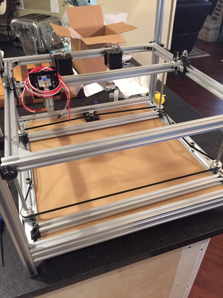 Nice build. As someone without a 3d printer to print custom parts, this build is something I'm very interested in, along with various ones that Keith is building. Can you put up a BOM? Or some additional information about extrusion lengths, etc? What about controller, firmwares? Final question, and one that makes me question some of the CoreXY...how does one go about replacing that Z axis belt without tearing 90% of the machine apart? My luck is that's something that breaks and ends up taking a week of work to replace when compared to things like direct drive on rods.