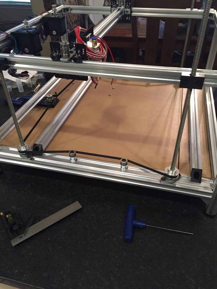 Quite a few updates since my last post. I got it all working with off the shelf parts, but was not satisfied with the quality of prints that i was getting and the reliability of the machine. I have spent quite a bit of time designing and printing new parts to replace the bought ones. So it is possible and with enough tweaking i'm sure it would create great quality prints. I did not achieve my desired print volume for many reasons (knew during the design phase it was probably not going to happen). I am sitting at 330x310x350 currently. With a little more to tweak in X & Y with some new part designs eventually. But i am happy with it for now. I also decided to locate my spool inside the cube so that is a limiting factor now (could pick up 30mm with a change in that immediately) but i like it in there and it works well. I started with a bowden setup but was very disapointed with the leaking and over extrusion (had 700mm of tube). For this size of printer it just didn't work. I tried up to 10mm of retraction with not much gain in print quality. So i decided to sacrifice some speed for a better print quality and went direct drive. I am trying a couple different sizes of motors to find the happy medium between weight and torque. Using one that is only 20mm thick right now (13in/lb), it works most of the time but there are some skipped steps. Have a slightly larger one on the way. I also added some print bite and it is hands down the best modification i have made to the printer so far. ABS is now extremely easy to print with (with no warping). I have attached a zip file with all of the parts in solidworks along with the .igs that you requested sonya. Let me know if they don't work for some reason. One change i have made that is not reflected in the CAD files is there are 4 wheels on all of the gantry plates. I tried 3 on the Y gantry, but was getting some twisting in the gantry (some was caused by a bad tensioner design that has been redone). But, i did add 4 wheels before that and it fixed the problem. Added a few pictures below of its current state. Jezter, funny you bring that up. I did have my Z drive belt break a couple weeks back so i had to replace it. It was fairly simple, removed the front 2 bed bolts and like David said lift up the pillow blocks and slide it under. But after doing that, i will be designing some mounts for the lower pillow blocks so that the pulley will be located on the bottom. Making belt changes much easier by only having the remove the bolts on the front of the bed. Next is to add the plexi enclosure, i will be doing that soon. Otherwise i run it several hours most days and it works very well. Have put close to 3 rolls of filament through it so far. Still have not been able to sit down and put together a BOM but it is on my to do list.