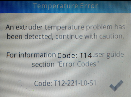 Tom, Have you found a way to stop/Get Around this error? No matter what I print about 10 minutes in the print will stop with that error? It is making it impossible to use the printer. I'm using Hatchbox ABS Green on a Black ABS cube cartridge on the left side. I haven't tried to do anything to the nozzle. I Patched with 1.0. Any thoughts?