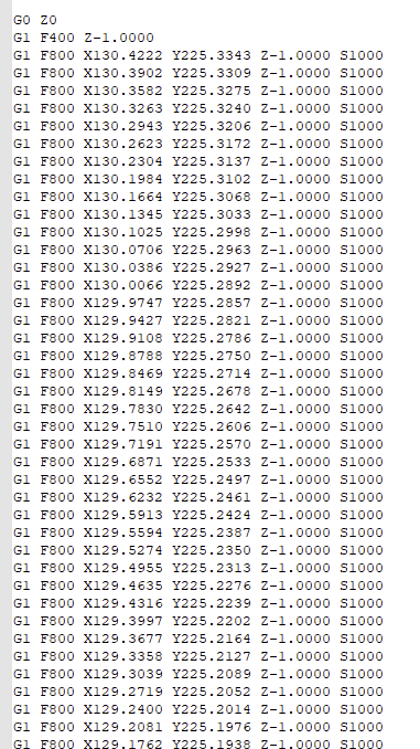 Using Openbuilds CAM and CONTROL... $0=10 ; Step pulse time, microseconds $1=255 ; Step idle delay, milliseconds $2=0 ; Step pulse invert, mask $3=0 ; Step direction invert, mask $4=1 ; Invert step enable pin, boolean $5=0 ; Invert limit pins, boolean $6=0 ; Invert probe pin, boolean $10=1 ; Status report options, mask $11=0.020 ; Junction deviation, millimeters $12=0.002 ; Arc tolerance, millimeters $13=0 ; Report in inches, boolean $20=0 ; Soft limits enable, boolean $21=1 ; Hard limits enable, boolean $22=1 ; Homing cycle enable, boolean $23=3 ; Homing direction invert, mask $24=100.000 ; Homing locate feed rate, mm/min $25=2000.000 ; Homing search seek rate, mm/min $26=250 ; Homing switch debounce delay, milliseconds $27=5.000 ; Homing switch pull-off distance, millimeters $30=1000 ; Maximum spindle speed, RPM $31=0 ; Minimum spindle speed, RPM $32=0 ; Laser-mode enable, boolean $100=198.109 ; X-axis steps per millimeter $101=198.109 ; Y-axis steps per millimeter $102=199.100 ; Z-axis steps per millimeter $110=3500.000 ; X-axis maximum rate, mm/min $111=3500.000 ; Y-axis maximum rate, mm/min $112=1000.000 ; Z-axis maximum rate, mm/min $120=350.000 ; X-axis acceleration, mm/sec^2 $121=350.000 ; Y-axis acceleration, mm/sec^2 $122=350.000 ; Z-axis acceleration, mm/sec^2 $130=1180.000 ; X-axis maximum travel, millimeters $131=1270.000 ; Y-axis maximum travel, millimeters $132=90.000 ; Z-axis maximum travel, millimeters $I=leadmachine1515