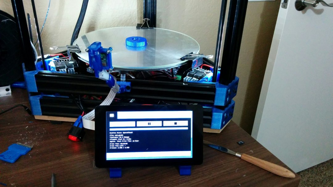 The printer in all its glory. Just ignore the junk around it. It is powered by a Duet 0.8.5 controller and I have installed a 4.3" PanelDue display.