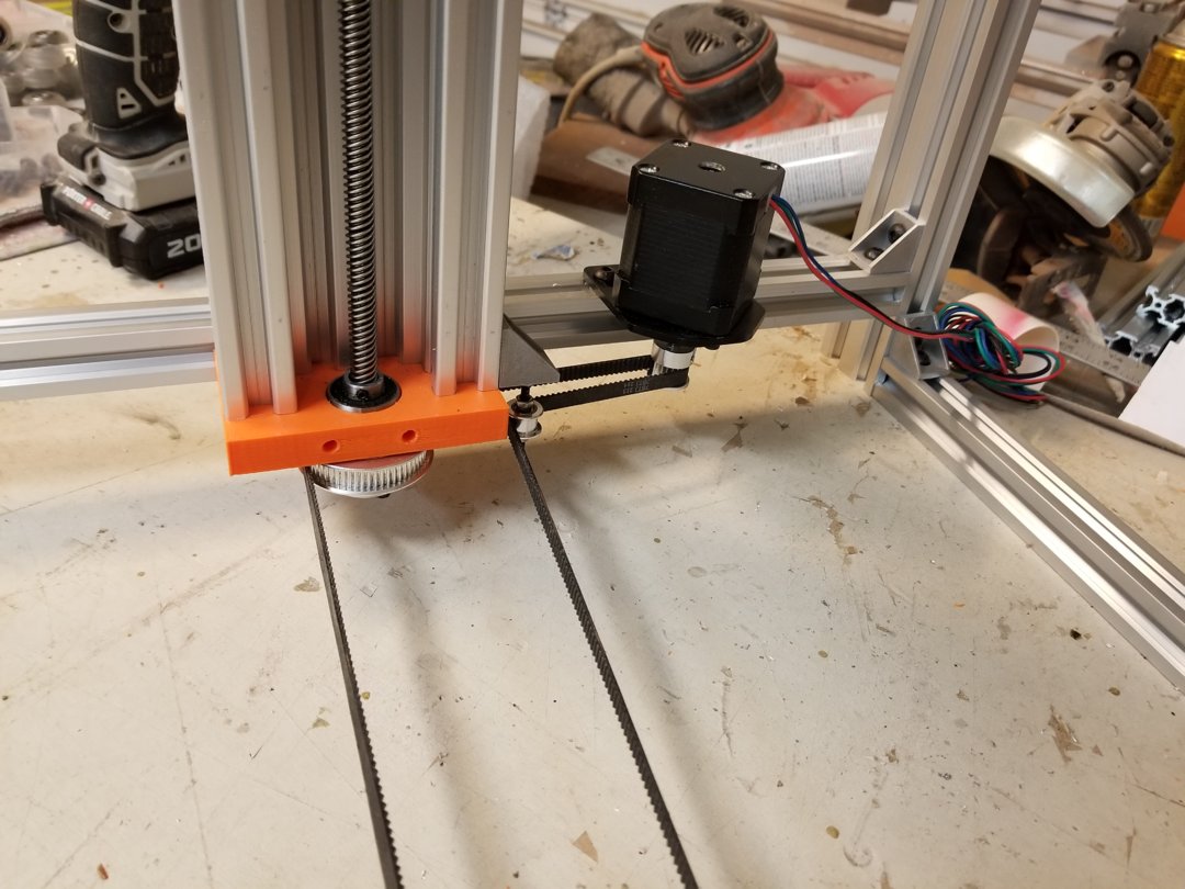 Ok, I had an epiphany last night on a clean way to drive the z axis without using a Nema 23 / external driver and reduces the belt path quite a bit. I originally had my bed (which is quite large and heavy - 1/4 MIC 6 aluminum plate 15"x15") being driven by a single Nema 17 but using reduced gear ratio of 3:1. It had no problems moving the bed up and down. What do you think of this? You can slide the stepper mount along the 20x40 rail to add tension, no idler pulleys necessary. Also, no need for that long 20x80 piece between the 2 Cbeams