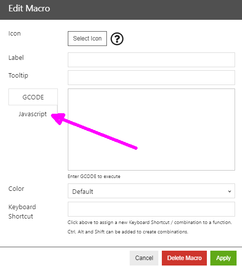 I pasted it in the javaScript tab, but there was no apply button. So, I had to click back on the gCode tab in order to apply and save. It was still pasted in the javaScript tab, but it was showing as a gCode on the main screen that you pointed out. It wouldn't work, but I just tried on a different cpu and the apply button appears in the javaScript tab and appears to work. I will go back and see if it is there on my laptop.... I apologize it is never easy with me. Thanks!