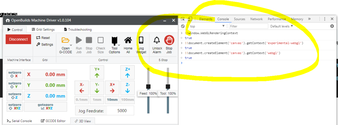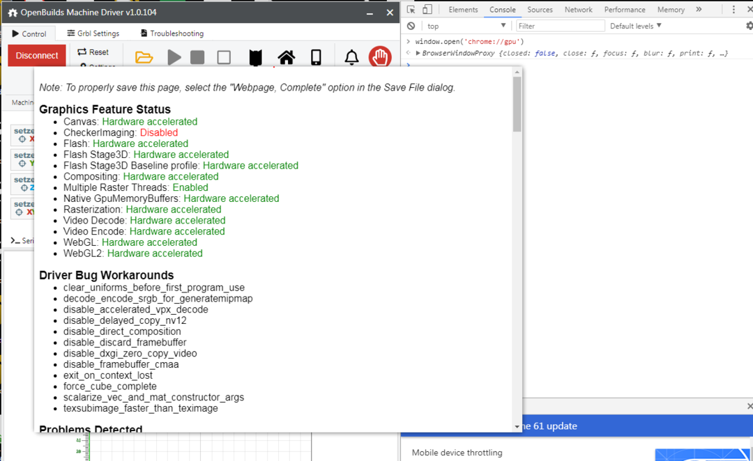 By nature yes, WebGL can get memory hungry with large files (lots of small moves) OpenBuilds CONTROL is meant for that "Something easy to get you started" - so as you outgrow it with more advanced needs (work coordinates, advanced setups, rotary work, massive files etc) - we almost hope as you grow, so too does your need for better software. Making software to fit both beginner and adanvanced users, always ends up sacrificing something for both. As our dream is to make CNCing easier for everyone, we also have to compromise on some things. Running on the machine without WebGL - will run just fine, without the preview. If we detect the that the machine doesnt have webgl, we also dont enable gcode parsing, 3d viewing and all other functions requiring webgl. So it speeds things up a lot. As for why the machine doesnt support webgl: we simply check what chromium says the machine can or cannot do. Its always a case of drivers, hardware or OS configuration: All we do is check if the machine has a WebGLRenderingContext and can create an experimental-webgl canvas: var webgl = (function() { try { return !!window.WebGLRenderingContext && !!document.createElement('canvas').getContext('experimental-webgl'); } catch (e) { return false; } })(); Do post some of those big files that crash out as a white screen and I'll see if we can see why it fails