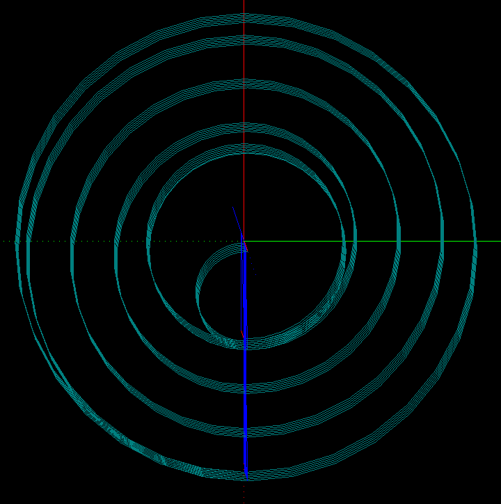 Here is a diameter first mode hole drill operation. 0.6mm bit, 2mm diameter hole, 33% step over Note that this cycle (diameter first) first does a helical bore to full depth at 2x bit diameter (you don't want this) before doing each layer out to diameter (you want this) in a spiral. The spiral is really 2 half circles, start point (Y) to Y+stepover/2 then to Y-stepover for each rotation. The other option in SketchUcam is depth first, where it will do a helical bore to full depth for each step outward. Neither is exactly what you want, but the idea here is education not a complete solution (-: Exactly how it generates the hole boring depends on the bit diameter, hole diameter and stepover% if hole diam < 2x bit diam then it always does depth first (that is why I had to do a 2mm hole here, 1mm always comes out as helical bores to depth. if stepover is less than 50% then it always helical bores first, never plunges, deeming this a 'for hard materials' operation if stepover is > 50% then it will plunge the center of the hole to depth, deeming this a 'soft material' operation. SketchUcam was born in the world of cutting foam board to make RC airplanes so this makes sense in that world, you can cut foamboard at pretty much any rate you like, plunge with almost any tool etc, very forgiving. Titanium, not so much (-: Note that there are limits as to what you can do in Sketchup at the small end of the scale because it does internal comparisons to 0.001 inch, if the difference between numbers is less than that then they are regarded as equal. SketchUcam code does comparisons to much less than that (I had to write my own function for it), but now and then the Sketchup comparison will mess you around.