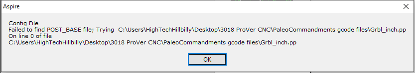 We manually put the files into C:\ProgramData\Vectric\Aspire\V9.5\PostP Then, we re-launched Aspire. It generated the following error, when it re-launched.