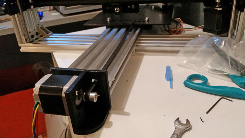 IMAG0757 by OrigamiB posted May 30, 2016 at 10:47 AM I just use an openbuilds plate, but placed on the side. I'd suggest this over printed motor mounts any day. My Y axis motor still shows some signs of bending, despite being very chunky. I think you could use a printed mount, if you could support the motor from behind (eg, by the rear mounting holes, the body itself, or if you have a motor with a rear shaft), or by using a small bearing on the end of the shaft at the front (assuming you have some protruding out, I don't). The high tension will always causes pivoting around the mounting holes in a plastic mount, the metal openbuilds mount stops this nicely, and much smaller than any printed mount *EDIT* The silver bar at the front is for bracing, as the 20x20 rails will spin around the tapped end. I simply used a leftover spacer from the Z-axis motors, and some leftover fixings.