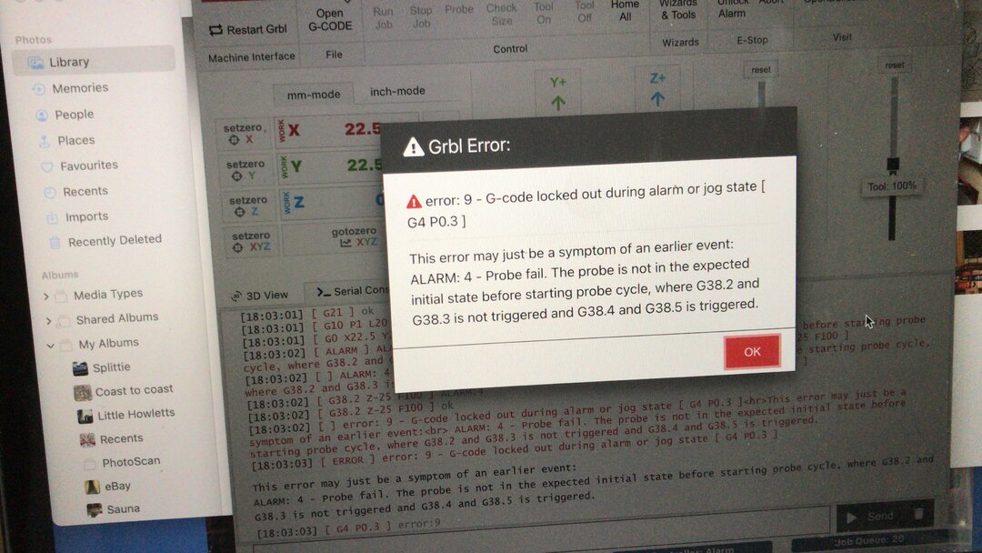 And btw, I also checked there's no continuity between end mill and GND. When I run the Probe routine (after confirming position) the spindle moves +22.5mm in X and Y before error code shows. Not sure if this is relevant, but everything I've tried so far yields the same result :(